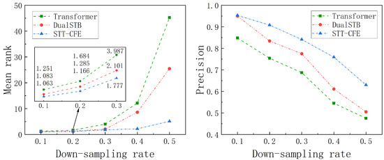 The result indicates that STT-CFE performs well at all evaluated down-sampling rates. Furthermore, we observed a notable decline in DualSTB’s robustness when faced with low-quality trajectories (specifically, when the down-sampling rate exceeds 0.3), which aligns with the significant performance degradation previously noted in TrajCL experiments.
