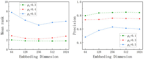 The impact of the number of embedding dimensions. We explore the impact of the number of embedding dimensions by varying it from 64 to 1024, as shown in Figure 9. The experimental results show that overall performance increases with the number of embedding dimensions up to a certain point, but then starts to decline. This trend can be attributed to overfitting when the number of embedding dimensions becomes too large. Notably, the overfitting phenomenon becomes more pronounced as the quality of the trajectories decreases. However, it is important to highlight that the precision metric is less sensitive to overfitting compared to the mean rank. Thus, we default the number of embedding dimensions to 256.