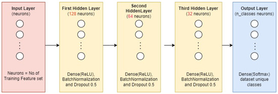 The input layer is determined by the training dataset’s feature set shape, with the number of neurons matching the feature count. This dynamic design adapts the ANN to various datasets. The model includes three hidden layers using ReLU activation. The first hidden layer has 128 neurons, Batch Normalization, and dropout (0.5). The second and third layers have 64 and 32 neurons, respectively, with similar configurations. The output layer uses a dense layer with a number of neurons equal to the unique class count, and Softmax activation generates probability distributions. The model is compiled using the Adam optimizer, categorical cross-entropy loss, and accuracy metric.