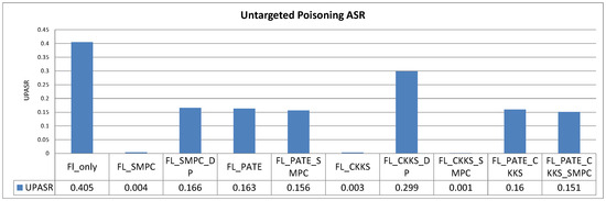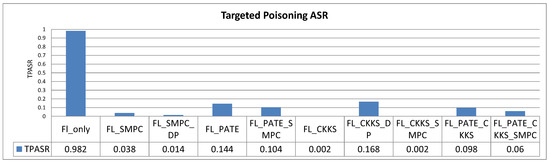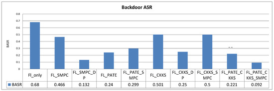 Equation (1) shows the general calculation of the ASR. The ASR can by calculated by dividing the number of attempts in which the attack actually succeeded in fooling the ML model by the total number of attack attempts, and the result is then multiplied by 100 to obtain the percentage. Specifically, in the case of poisoning attacks, the ASR will be the proportion of successful poisoning attempts to the total number of poisoning attempts, as noted in studies of ML threats that highlight the exploitation of vulnerabilities in ML systems [60,61]. For backdoor attacks, it represents the proportion of successful backdoor triggers to the total number of trigger attempts [59,62].