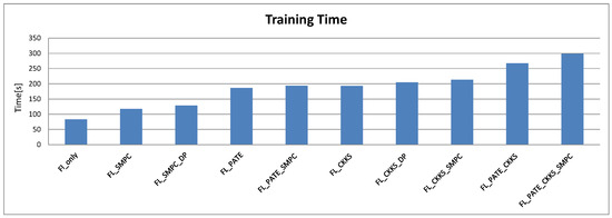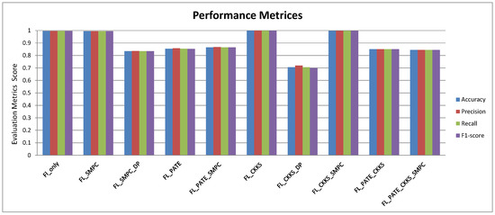 In [26], the authors proposed an FL system for the Internet of Medical Things. The system integrates SMPC and an additive secret-sharing method, along with FL. With this method, the federated training model’s gradient parameters—rather than the actual data—are protected. The prediction of the suggested model is made using a Convolutional Neural Network, which uses a weight-sharing technique. The model’s weight is encrypted through additive secret sharing and multiple computations. The accuracy rate of the suggested model is 97%. In addition, the suggested model’s F1-score is 89%. To the best of the authors’ knowledge, this is the first study comparing different possible combinations of privacy-preserving techniques with FL. There also is not previous work considering the combination of FL with more than two privacy-preserving methods out of the PATE, SMPC, and HE.