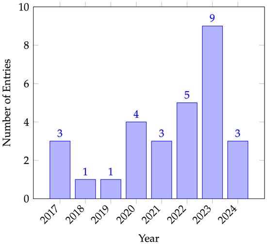 This section presents the findings from the reviewed studies. Figure 3 shows the distribution of studies per year, highlighting the increasing research interest in games, serious games, and gamification for food waste management from 2017 to 2024.