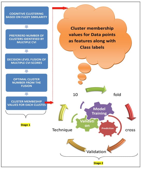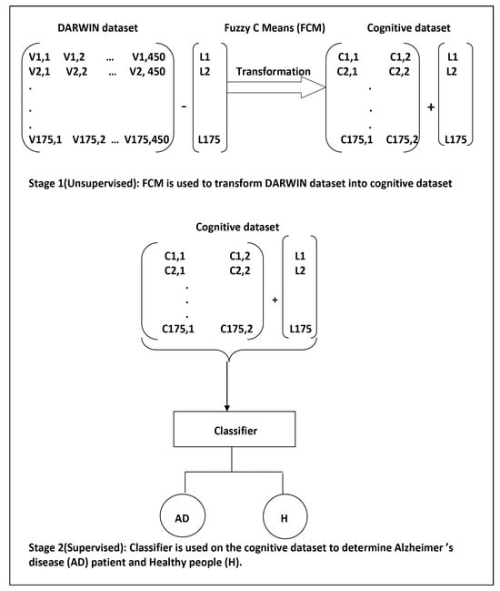 We conceptualize the fuzzy membership matrix as a dataset imbued with cognitive features. In this analogy, each cluster center represents a distinct cognitive feature, while the membership degree of a handwriting sample corresponds to the value of that feature. The term “cognitive feature” is employed to signify the output of the Fuzzy C-Means algorithm, as it encapsulates patterns extracted from handwriting data believed to correlate with cognitive function, particularly in the context of Alzheimer’s disease prediction. In the second stage, these cognitive features serve as inputs for constructing predictor models using supervised learning techniques. We anticipate that employing unsupervised cognitive values will enhance the performance of supervised ML models, promising more accurate Alzheimer’s risk identification and dementia prevention. The main contributions of this study can be summarized as follows: