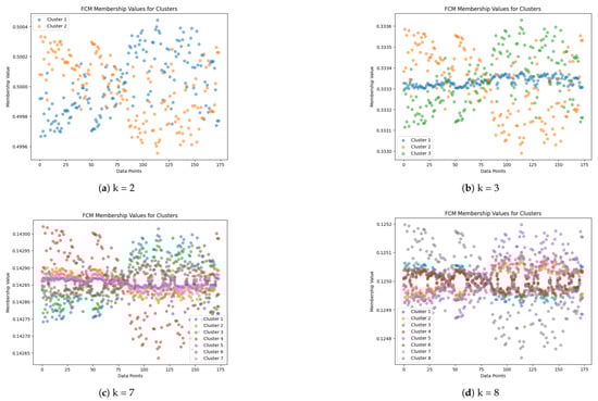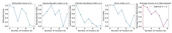 An important consideration when utilizing FCM is the determination of the optimal number of cluster centers, as this directly influences the data partitioning process. By selecting an appropriate number of cluster centers, we could effectively uncover significant patterns within the data and accurately perform a categorization. To quantitatively assess cluster quality and separation, we employed four widely recognized Clustering Validity Indices (CVIs): Silhouette Score [], Davies–Bouldin Score [], Calinski–Harabasz Score [], and Dunn Score []. Clustering Validity Indices (CVIs) serve as metrics for evaluating the quality of clustering outcomes derived from clustering algorithms. Below, we elaborate on these four commonly utilized CVIs: