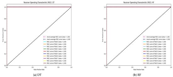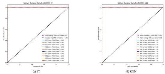 Building upon the insights gleaned from the hyperparameter tuning phase, we proceeded to conduct a rigorous evaluation of each algorithm’s performance using 10-fold cross-validation. This meticulous validation approach allowed us to robustly assess the algorithms’ predictive capabilities and generalization performance across different subsets of the dataset. The outcomes of these validation experiments are meticulously documented in Table 9, offering a detailed glimpse into each algorithm’s performance metrics and highlighting their respective strengths and weaknesses. Figure 5 displays the AUC-ROC for each fold, as well as the micro-average and macro-average ROC curves for the Decision Tree (DT), Random Forest (RF), Extra Tree (ET), and K-nearest-neighbor (KNN) classifiers. AUC-ROC curves for all other classifiers are presented in the Supplementary Materials.