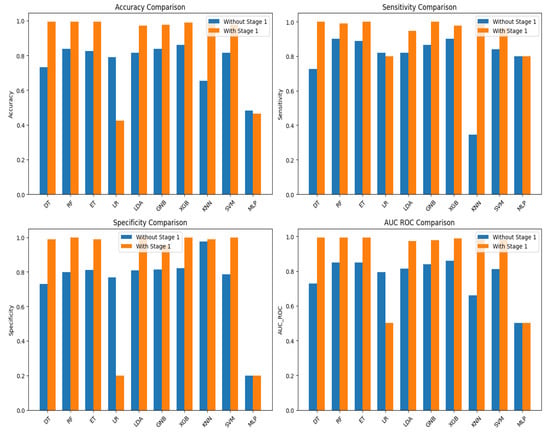 Interestingly, a notable observation emerged from our analysis: all classifiers, with the exception of Logistic Regression (LR) and Multi-layer Perceptron (MLP), demonstrated a significant enhancement in their predictive capabilities when leveraging the insights gained from Fuzzy C Means (FCM) clustering at Stage 1 (Figure 6). This finding highlights the invaluable role of unsupervised clustering in augmenting the predictive power of supervised learning algorithms, particularly in the context of AD diagnosis through handwriting analysis.