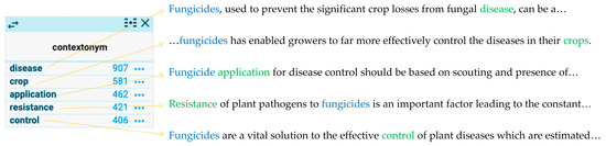 Contextonymic WS of the term fungicide in an Agriculture corpus and associated concordances [28].