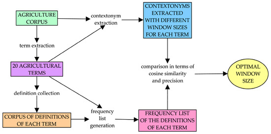 For each term, the frequency list extracted from the definition corpus was compared to the contextonym lists on two metrics: cosine similarity, and the precision of the contextonym lists with respect to the frequency list of the definition corpus. This comparison determined which contextonym list was most similar to the frequency list of the definition corpus. For example, for monoculture, we compared a frequency list extracted from its definitions with its contextonyms, obtained with different context windows (5, 10, 20, etc.). This operation was repeated for each term. The optimal context window was the one that yielded the best average of normalized cosine similarity and precision. Figure 3 visually represents the methods used in this research.