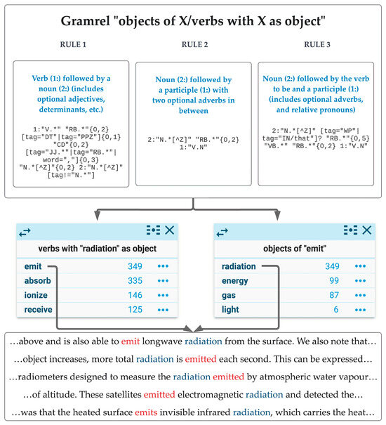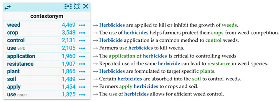 Syntactic co-occurrence should be complemented with an analysis of semantic co-occurrence. Two words are semantic co-occurrents if they establish a semantic relation in a given linguistic context (hyponymy, meronymy, cause, etc.) [28]. Semantic co-occurrents can be identified by querying corpora with knowledge patterns or lexico-syntactic patterns that convey a specific semantic relation [29,30]. For example, the knowledge pattern “x and other y” (e.g., “glyphosate and other pesticides”) conveys a hyponymic relation between x (glyphosate) and y (pesticide). The conceptual information extracted with semantic co-occurrence is generally more useful for definition writing than syntactic co-occurrence. However, a major limitation is the need for large corpora to obtain meaningful results, coupled with the challenge of filtering out significant noise [30,31]. Noise can arise because knowledge patterns may not consistently express the expected semantic relation. Moreover, they can be polysemic since they can express more than one semantic relation. Additionally, the effectiveness of knowledge patterns varies across different knowledge domains and genres [32].