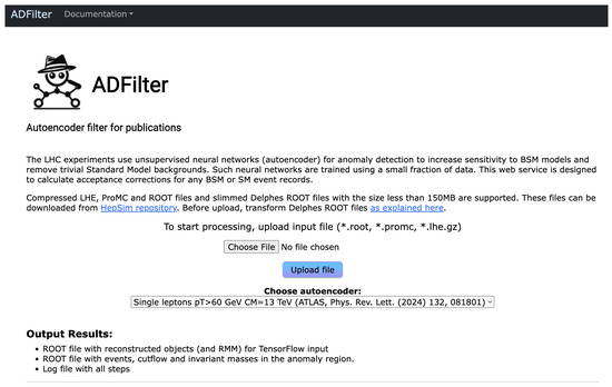 The ADFilter (Anomaly Detection Filter) webpage [9] features the user interface shown in Figure 1. The public version includes the AEs described in [6,8]. The LHC paper [6] employs a subset of the Run 2 ATLAS data, while the second paper relies on SM MC simulations for AE training. The autoencoder uses selection criteria based on single-lepton triggers, accepting events with at least one lepton with transverse momentum GeV. This cut effectively reduces the multijet background, which dominates the LHC data.