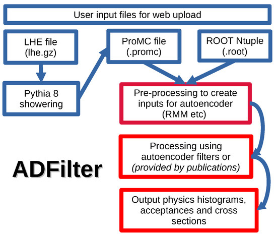 The ADFilter web tool accepts a variety of input files containing collision events. These input files must be generated with the same center-of-mass collision energy as the events used for AE training. Figure 2 shows the diagram demonstrating the workflow of ADFilter, starting from the input files to the final results. In the following, we will describe these steps in more detail.