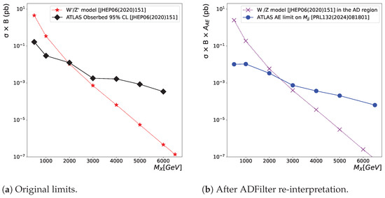 (a) Observed (filled diamonds) 95% credibility-level upper limits [24] on for the production cross-section. The limit is shown as a function of , where X denotes the mass of derived from dijet masses. Events with at least one isolated lepton with GeV were used. Red-filled stars show the scenario with . (b) The 95% credibility-level upper limits for Gaussian-shaped signals with the width of published by the ATLAS collaboration; see Figure 4 of the publication [6]. These limits are multiplied by from Ref. [24]. Only points for which this correction exists are shown. The magenta crosses show the observed cross-section after the ADFilter correction, which is close to 95%. Without anomaly detection, the process for could not be excluded, but it is reliably excluded at 1.35 TeV after the AE.