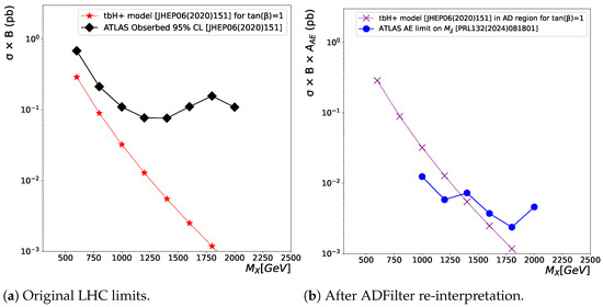 The situation changes drastically when applying ADFilter. Figure 4b shows the limit with GeV plus the AE selection [6] for signals with a width of . These limits were multiplied by the factor , as reported in [24]. To justify this correction, we assume that the width of for the process is roughly similar to the width . Then, the ADFilter was used to estimate the AE correction for the charged Higgs process created with MadGraph5_aMC@NLO. According to the calculated ADFilter acceptance, the observed cross-section for the process does not change significantly after applying anomaly detection, since the reported ADFilter acceptance was above 95%. The large AE acceptance indicates that the events are highly anomalous, compared to the SM events represented by the AE. Figure 4b shows the limit with the cut GeV plus the AE selection [6] for signals with the width of . This creates a crossing point of the observed limits (shown with blue-filled circles) at 1.35 TeV with the cross-section from MadGraph5_aMC@NLO after the 95% correction by ADFilter.