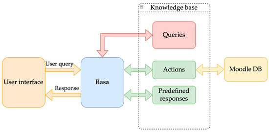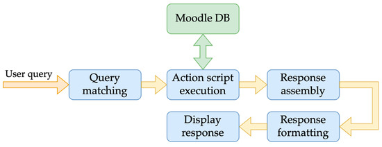 In general, there are two types of responses. The first type is predefined responses within the knowledge base that correspond to certain queries and will be returned to the user immediately. This type generally relates to queries that prospective students make, such as ‘what is the duration of the MSc program’. In this case, the responses are fixed and do not need further processing to produce. The second type is responses generated by actions. Actions are functions that are triggered by specified queries, and after some specific processing, they generate the returned response as a string. Actions are also part of the knowledge base and are defined in a separate file as Python functions, and their correspondence to particular questions (conversation flow) must also be defined. It can be seen that this kind of processing for the generation of the response is required when some personalization of the response is required. For example, when a query requires some information on a student, access to the Moodle database and processing of the retrieved data for the particular student is needed, and so in this case, the implementation of an action is necessary. For this reason, actions are usually employed for queries made by current students. Actions are, therefore, the focus of the Rasa service implementation in this study and are explained in more detail in the next section.