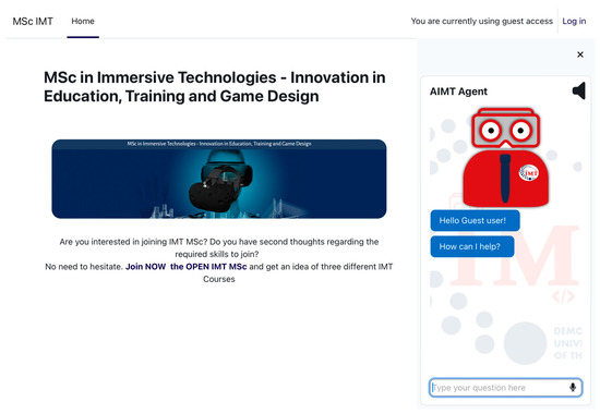Despite issues such as privacy and personalization that may be impacting the adoption of this technology [23,24], it is clear that conversational agents are steadily becoming an increasingly popular option in educational settings. From the literature overview presented above, it is revealed that these systems lack personalization and that very few are fully integrated into existing and widely available learning platforms, which are commonly used in various courses, especially in distance education. The present paper attempts to address these shortcomings by introducing an AI-based conversational agent named AIMT Agent, which was developed specifically for the MSc in Immersive Technologies—Innovation in Education, Training and Game Design (IMT), a postgraduate program at the Department of Computer Science of the Democritus University of Thrace. The motivation behind the development of this agent is two-fold: Firstly, to introduce an automated system for providing information regarding the MSc program to prospective students, and secondly, to employ an always-online assistant for the support of current students in their postgraduate studies. For the latter case, the assistant is using the resources in each student’s enrolled courses in order to provide guidance regarding their coursework and other educational activities. Therefore, the proposed conversational agent offers a novel approach by (a) providing personalized assistance to each student and (b) being fully integrated into the chosen learning management system. The paper also reports on the results of this evaluation by the users. The agent was evaluated according to the Technology Acceptance Model (TAM) originally proposed by [25], which is a commonly used tool to evaluate software in terms of usefulness and ease of use. At this stage of the development, the objective of the evaluation is to validate the proposed integration of the LMS with the conversational agent, to ensure that the chosen user interface is appropriate, and to ascertain whether the users respond positively to the provided functionality.