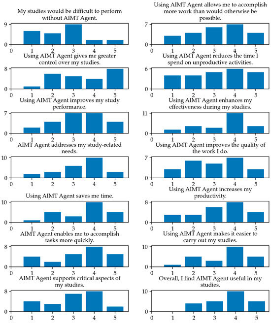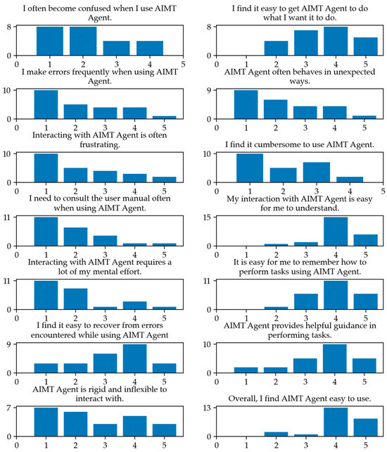 In the next section of the questionnaire, users responded to questions regarding the usefulness of the AIMT agent. Figure 5 shows the responses to each of the questions in this section. Note that the x-axis scale ranges from 1 to 5, representing the responses ranging from “strongly disagree” to “strongly agree”, respectively. The y-axis represents the number of responses.