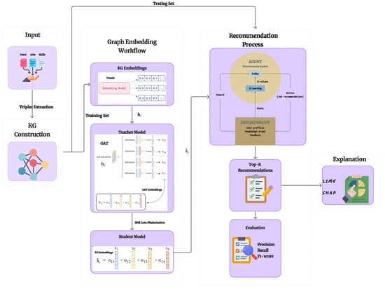 KG triples are formed by combining user–skill, job–skill, user–occupation, and job–occupation links. Skills are assigned numerical indices that allow them to be used as features. PyKEEN’s TriplesFactory is used to manage the triples, which are divided into training (85%) and testing (15%) sets. The training set is used to learn the KG embeddings and refine them using KD, resulting in the graph embedding flow. The test set is used to evaluate these embeddings, followed by an evaluation of the job recommendation process to ensure that the Q-learning model selects the best job recommendations.