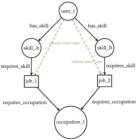 The KG triples are represented as (user_1, has_skill, skill_1), (job_1, requires_skill, skill_A), and (job1, requires_occupation, occupation_1), capturing the relationships between users, skills, jobs, and occupations. In Figure 3, the KG structure is illustrated, with nodes representing users, skills, jobs, and occupations, as well as the relationships between them, such as “has_skill”, “requires_skill”, and “requires_occupation”, represented as directed edges.