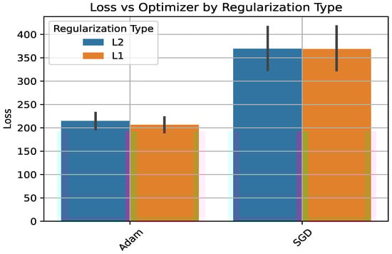 The plot comparing the loss for different optimizers (Adam and SGD) demonstrates that Adam consistently outperforms both regularization approaches (L1 and L2) (Figure 8). Adam outperforms the SGD optimizer in terms of loss values, especially under L2 regularization.