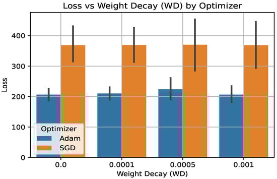 As we increase the weight decay (L2 regularization), the loss increases, especially for the SGD optimizer (Figure 9). Adam adjusts well with an increase in weight decay, retaining relatively moderate loss values across different decay levels. This implies that Adam is less vulnerable to different degrees of regularization, whereas SGD is more sensitive to weight decay.