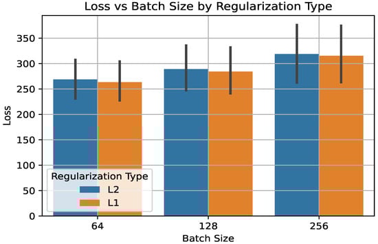 In the comparison of loss and batch size (Figure 10), we can observe that increasing batch size tends to increase loss, particularly for larger values like 256. The regularization strategies (L1 and L2) exhibit this pattern, with L1 performing somewhat worse overall. This could indicate that smaller batch sizes result in more frequent updates, which leads to greater optimization results.