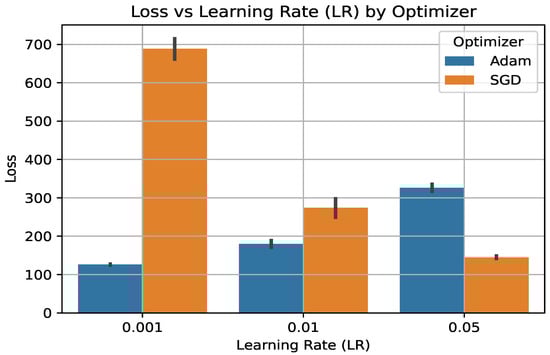 As the learning rate increases, we see a non-linear response in loss values (Figure 11). For low learning rates (e.g., ), the loss is minimal, especially for Adam. As the learning rate increases to 0.01 and 0.05, the loss values for Adam and SGD increase, with SGD becoming especially unstable at higher learning rates. This emphasizes the importance of adjusting the learning rate for optimal performance, and lower learning rates are generally advantageous for this problem.