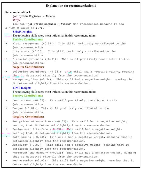 - For recommendation 1 with LIME explanation, job_System_Engineer_-_Athens has the highest Q-value at 8.78. Positive factors include “lead a team” and “Basque”, indicating leadership, and Basque language skills enhance fit for this role. Negative factors such as “setting prices of menu items”, “design user interface”, and “data mining” suggest that these skills are less relevant for this role. SHAP results show positive contributions from skills in alter management (+0.51), literature (+0.35), and knowledge of financial products (+0.31), indicating that adaptability, communication, and financial knowledge may be critical to the role of system engineering with financial systems. Negative contributions include soldering techniques (−0.38) and managing supplies (−0.34), suggesting that these hands-on skills are less aligned with the job.