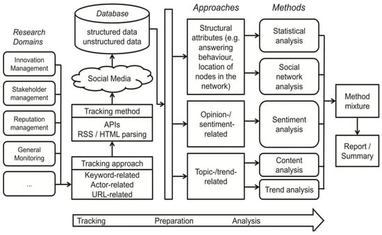 In order to support commercial decision-making, social media monitoring is an iterative process of methodically examining networks for pertinent information regarding subjects, target audiences, and rivals [56,57,58,59]. In contrast to traditional business analysis approaches that rely on historical data, this process uses real-time data and involves the collecting and evaluation of unstructured data to generate opinions and evaluate the influence of specific players [58].