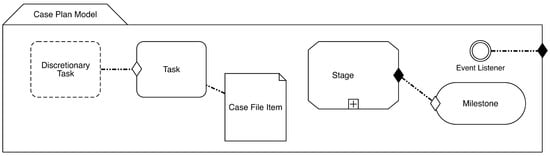 - Kurz, M.; Schmidt, W.; Fleischmann, A.; Lederer, M. Leveraging CMMN for ACM: Examining the Applicability of a New OMG Standard for Adaptive Case Management. In Proceedings of the 7th International Conference on Subject-Oriented Business Process Management, Kiel, Germany, 23–24 April 2015; pp. 1–9. [Google Scholar]