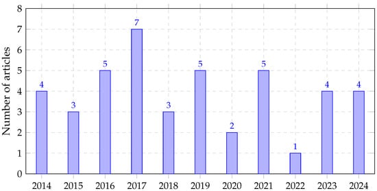 Figure 2 shows the distribution of relevant articles by year of publication, covering the period from 2014 to 2024. The number of articles fluctuated over the years, with the highest number published in 2016 and 2018. This trend may indicate initial research momentum following the release of the CMMN specification, and a renewed interest around 2018, potentially linked to methodological or tooling developments.