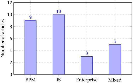 To further understand the disciplinary background of the research, Figure 4 shows the distribution of conference fields. We categorized conferences based on their thematic scope and found that most CMMN-related articles were presented in the fields of Business Process Management (BPM) and Information Systems (IS), with fewer contributions from the Enterprise Modelling and Mixed/Other domains. This supports the view that CMMN research is closely linked to ongoing discourse in process modelling communities.