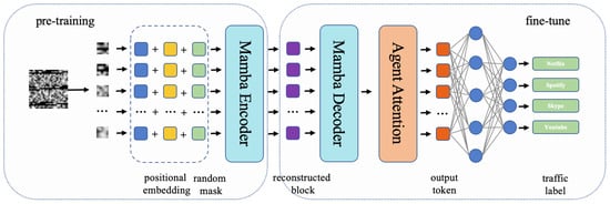 The overall framework of the encrypted traffic classification model ET-Mamba proposed in this study, based on the Mamba architecture, is shown in Figure 2, including its pre-training phase and its fine-tuning phase. This model built in the pre-training phase uses location coding for raw feature representation and a Mamba encoder for feature extraction; the Mamba decoder and agent attention mechanism are used for feature extraction in the model built in the fine-tuning phase. During the model training process, pre-training is carried out to obtain the hidden space representation of the encrypted traffic; then, the hidden space representation is fine-tuned to enhance the feature representation of the encrypted traffic and improve the model performance. Meanwhile, the SmoothLoss function is designed in the model to solve the problem of the insufficient generalization ability of the cross-entropy loss function during training.