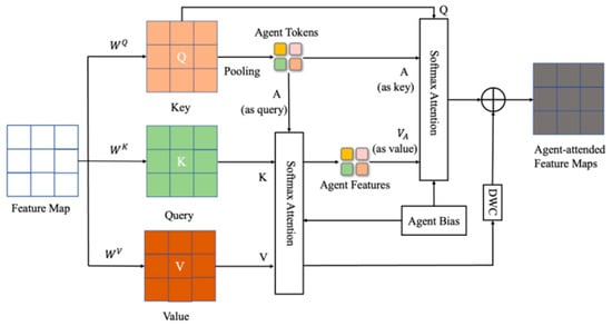 As shown in Figure 4, the agent attention mechanism introduces the concept of an “agent” performing a linear transformation on the input feature map X using Equation (7), resulting in the agent’s query , key , and value . Further, using Equation (8), the agent token is calculated.