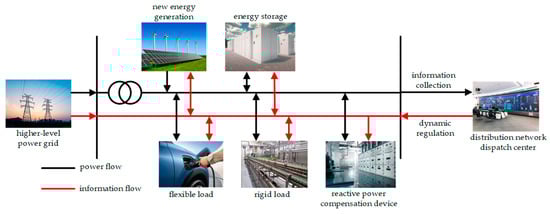 The most significant difference between active distribution networks and traditional distribution networks lies in their controllability and flexibility, which helps to achieve optimized scheduling and interaction in the power system. The interaction paths between each component unit in ADN, higher-level power grid, and distribution network dispatch center are mainly power flow and information flow. The former involves the actual transmission process of electrical energy, while the latter refers to the management functions of monitoring, scheduling, and fault handling achieved by various units interacting through communication networks. Power flow is regulated by information flow, and information flow relies on the state of the power flow to adjust the dynamic behavior [20].
