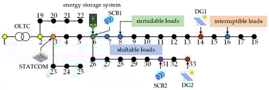 The improved IEEE 33-bus DN, as shown in Figure 3, was used as the simulation experiment object while maintaining its line parameters unchanged. Node 14 and Node 33 were set as the grid-connection points for distributed generations DG1 and DG2, respectively. An energy storage system was installed at Node 6. SCBs were installed at Node 6 and Node 31 respectively, with NSCB = 4, QSCB.rate = 150 kvar. OLTC was installed on branch 1–2, taking NOLTC = 8, D = 0.0125. A STATCOM device was installed at Node 3, with = 500 kvar, and = −500 kvar. Interruptible loads were installed at Node 16. Curtailable loads were installed at Node 8. Shiftable loads were installed at Node 7. The collaborative interaction model is also effective in addressing communication latency and data synchronization challenges. The model can reduce communication latency to a certain extent and improve real-time data synchronization through the collaborative interaction of data between nodes.