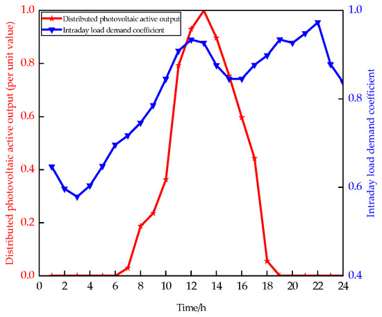 The simulation analysis data selected in the article are the 24 h distributed photovoltaic active output and the IEEE 33 distribution network intraday load demand coefficient on a typical day. The curve variation is shown in Figure 4.