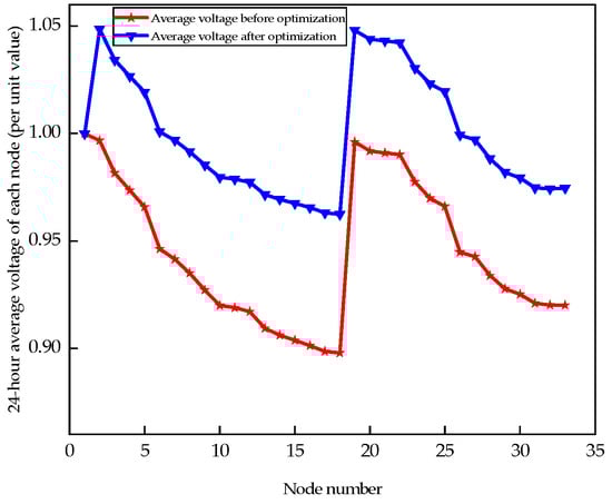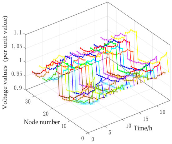 Through Figure 5, it was found that some nodes in the distribution network had voltage values below the lower limit before optimization, with the lowest value reaching 0.861015. At the same time, due to the high residential load level and lack of distributed photovoltaic output at night, the overall voltage level at that time was significantly lower than the normal level. However, with ESS and reactive power compensation device integration, the voltage amplitude for the distribution network system after source–network–load–storage joint planning was significantly improved, as shown in Figure 7.