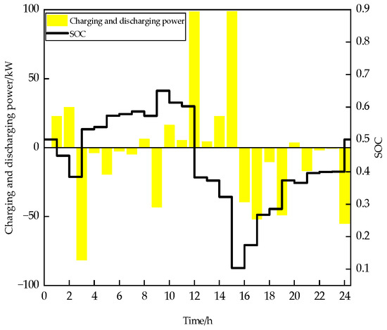 The state of charge (SOC) of ESS represents the ratio between its remaining capacity and its total capacity at time t. The range of SOC values is generally from 10% to 90%. If the SOC is 0%, it signifies that ESS has been fully depleted; if the SOC is 100%, it signifies that ESS has reached full charge, and its state of charge equation is as follows [22]: