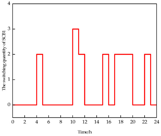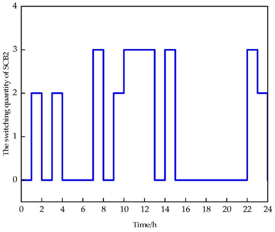 The switching process of shunt capacitor banks is shown in Figure 14 and Figure 15, where SCB1 outputs 300 kvar of reactive power during periods 4, 11, 15, 17–19, and 22, respectively. Only three sets of parallel capacitor units were switched during period 10. At the same time, SCB2 outputs 300 kvar of reactive power during periods 1, 3, 9, and 23. However, three sets of parallel capacitor units are also used during periods 7, 10–12, 14, and 22. It is not difficult to see that SCB significantly improves system stability through dynamic reactive power compensation.