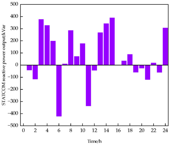 The various departments of the distribution network system achieve corresponding reactive power optimization strategies through data sharing and scheduling with each other, including the regulation of reactive power compensation devices and energy storage systems. Among them, STATCOM completes dynamic reactive power compensation by constructing self-commutation bridge circuits with switchable power electronic devices such as IGBT. Therefore, it is generally regarded as a continuous control variable, while the number of switching groups on the SCB and the tap position of the OLTC determine that it cannot continuously regulate reactive power output. Therefore, it is divided into discrete control variables. Considering the long response time and limited operating life of the SCB and OLTC, the control time interval is finally set to 1 h.