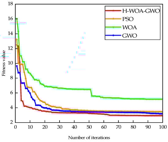 The H-WOA-GWO designed in study can simultaneously integrate excellent local search capability of GWO and powerful global search capability of WOA, as well as ability to explore unknown areas. It also has significant advantages in handling different types of decision variables and solving dynamic reactive power optimization with a large and complex number of decision variables. The fitness value iteration curve is plotted as shown in Figure 18.