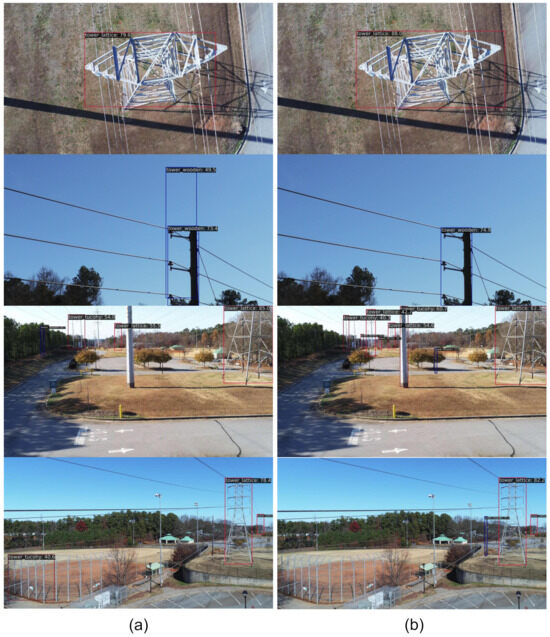 Outputs of (a) CenterNet and (b) CGDA on the TTPLA-tower dataset.