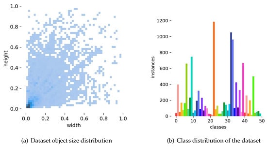 As illustrated in Figure 4a, the distribution of objects across various size categories is predominantly small, typically spanning only a few tens of pixels. Figure 4b highlights the class imbalance in the dataset, with some categories containing a disproportionate number of objects. This imbalance, together with the prevalence of small objects, serves to challenge the algorithm’s ability to accurately detect and recognize small targets.