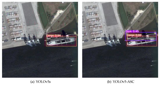 In comparison, it can be observed that the dock and the ship have overlapping parts, resulting in the loss of clear boundaries, which presents a challenge for target recognition. The detection result of the original model (Figure 6a) fails to successfully differentiate between the dock and the ship. In contrast, the proposed model demonstrates an advantage in handling this challenge and clearly differentiates between the dock and the ship, as shown in Figure 6b.