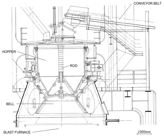 The charging system, at the top of the BF under consideration, consists of the conveyor belt, the hopper, the deflector and the bell, which can move, vertically actuating the rod. Figure 1 shows a sketch of conveyor belt-hopper-bell system for the original rotating scheme. The deflector is installed on a hatch of the hopper, as shown in Figure 2, so that it can be easily removed. The conveyor belt has a tilt angle of and it runs at speed 1.79 m/s. It transports the carbon coke to the top inlet of the hopper, where it is released into the hopper, abandoning the belt. Falling, the coke particles impact on the deflector and they are distributed on the bottom of the hopper, consisting of the bell. A part of the particles impact on the deflector and then on the bell, the rod and the walls. When the required amount of coke is loaded, the bell descends downwards, allowing the burden to slide into the BF, forming a layer of material. At this point, the bell moves up, until it closes the bottom of the hopper, and the whole operation is repeated similarly for the iron ores charge. The process continues in this way, alternating carbon coke and iron ores charges.