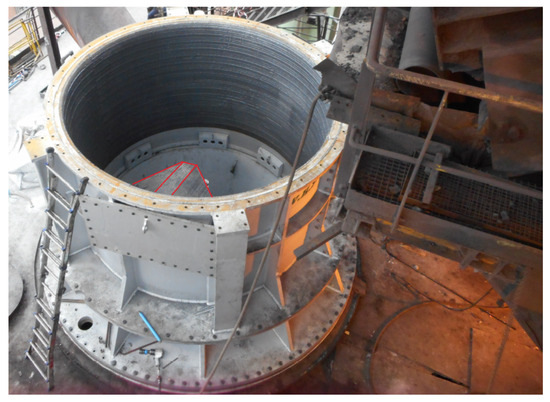 This study exclusively focuses on the charging system. The radial and circumferential distribution of the burden (coke and iron ore) in the furnace, stacked alternately in layers, plays an important role as it directly affects the reduction process. Therefore, the charging system should be capable of controlling where the materials are deposited with optimum layer thickness. The simplest charging system of BFs consists of a hopper and a single bell. Old concept plants use a double-bell system to control the entry of raw material into the BF. Bell-less systems, such as the Paul Wurth or Gimbal systems, are more common in recent plants and are able to provide the desired charge distribution within the blast furnace. A complete description of these charging systems can be found in Strassburger [21] and McNeil [22], to name a few. Of course, the bell-less system is the most widely analyzed, and recent works can be found in the literature [23,24,25,26,27].