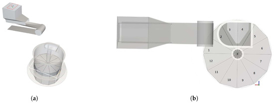 The radial sectors into which the hopper is ideally divided: (a) axonometric view; (b) top view with the numbering of the radial sectors into which the hopper is virtually split.