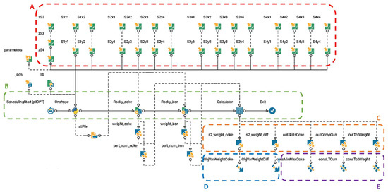 Set B in Figure 4 consists of the operative nodes. With reference to this scheme, the process runs from left to right, starting with optimization algorithm pilOpt which generates the designs, Onshape for the creation of geometry, Rocky DEM for the simulation of coke and iron ores charges, and finally, the calculation of outputs from the results of simulations.