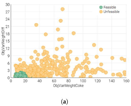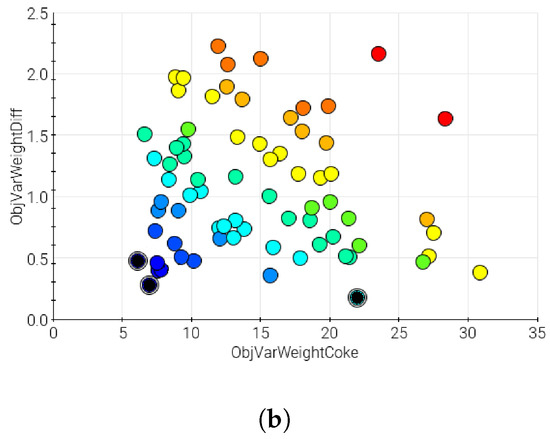 Informally, variance measures how far a set of numbers are spread out from their average value. Thus, the minimization of and means a reduction in the fluctuations in the coke percentage weight and the difference between the iron and coke percentage weight, respectively, among the sectors into which the hopper was ideally divided. Due to the chosen multi-objective formulation, it is possible to enclose the requests for homogeneity of the distribution in the hopper and the similarity of the distribution of the two charges, independently of the burden material. In fact, if were low but were high, the situation would be that of a uniform coke charge, but the same could not be said of iron ores. With minimum values for both, it is possible to obtain the ideal situation of uniformity of charges with similar distributions varying the material.