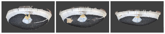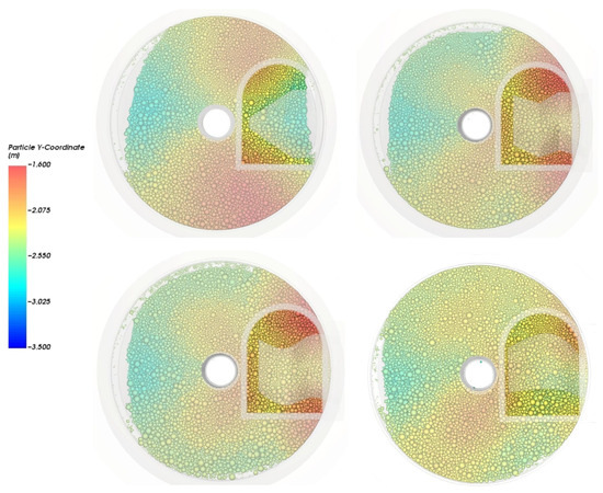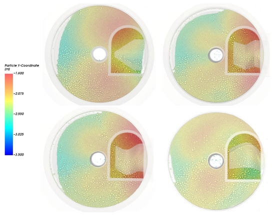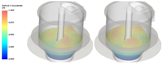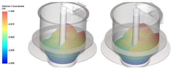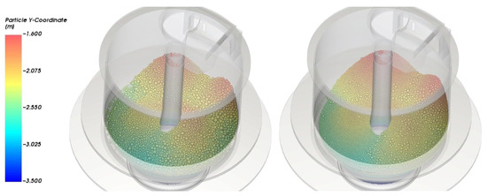 In Degrassi et al. [28], a DEM solver (Rocky DEM) is used to simulate the hopper charging of coke coal and the hopper charging of iron ores with this system. All the assumptions made to simplify the process to be simulated—mainly in order to reduce the computational time—and the parameter calibration details can be found in the cited work. The particle distributions obtained by the simulated charges have clearly no radial symmetry. The materials are distributed unevenly in both quantity and particle size. The deflector and the rod obstruct the passage of particles, creating vacuum zones where the material has difficulty in settling. Moreover, the deflector shape emphasizes the segregation caused by the conveyor belt, effectively separating large and small particles into two different piles, hence the need to optimize this device.